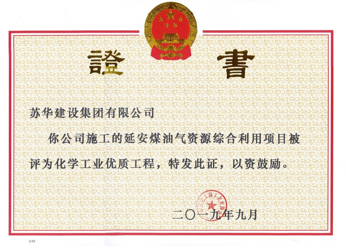 最近,我公司又獲得了由中國化工施工企業(yè)協(xié)會頒發(fā)的全國化學(xué)工業(yè)優(yōu)質(zhì)工程獎狀。陜西延長石油延安能源化工有限責(zé)任公司建設(shè)的延安煤油氣資源綜合利用項(xiàng)目熱動力站項(xiàng)目。由我蘇華建設(shè)集團(tuán)有限公司上海分公司承建。該項(xiàng)...